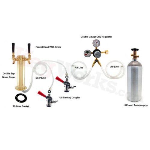 This kit contains everything you would need to dispense two beers at once. Just make sure that the fridge you want to use is large enough to hold two kegs. The kegs must sit perfectly flat. The CO2 tank can either go inside or outside of the fridge. In stock and ready to ship. Features: Dispense most North American beer. Complete with everything you need except the keg and fridge. Includes: Double tap brass tower. Two product double gauge regulator kit. (2) plastic faucet knobs. (2) lever type US Sankey keg couplers. (1) 5lb CO2 tank (shipped empty). 5’L air line. 5’L beer line with connectors. Detailed instructions.This kit contains everything you would need to dispense two beers at once.