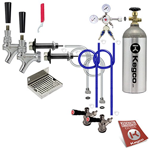Kegco has become synonymous with quality in the beer industry. All their beer parts are manufactured to the highest commercial grade standards.The Deluxe Double Keg Tap Conversion Kit comes with everything you will need to successfully convert your refrigerator or chest freezer into a two product draft beer cooler. The standard chrome beer faucet is the most commonly used faucet in the industry. The durable metal lever handle “D” system beer coupler is compatible with all domestic brand kegs. The regulator has a large hand control which makes it easy to adjust the pressure inside the keg. This is a dual gauge regulator with the main gauge indicating how much Co2 pressure is inside the keg and the second gauge indicating how much Co2 is left in your tank.The Kegco 5 lb Aluminum Co2 Tank is produced from high strength aluminum alloy 6061-T6. These tanks are popular because they are not as heavy as steel tanks and do not rust. This keg tap kit is designed to run two completely separate kegs. Depending upon your refrigerator capacity, you can run 2 full size kegs, 2 pony kegs, 2 6-gallon kegs or any combination you choose. All the draft beer parts are of the highest commercial grade quality which are designed and built to last.Commercial Grade Gauge Co2 Regulator with Co2 Splitter and New 5 lb Aluminum Co2 Tank
