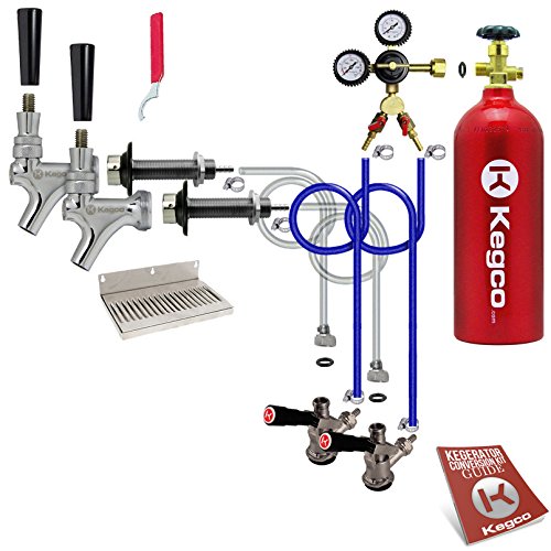 With Kegco’s Deluxe Two Keg Kegerator Conversion Kit, you can quickly and easily go from owning a plain refrigerator or freezer to dispensing fresh-tasting beer straight from the keg with your very own draft beer dispenser! Kegco has drawn on years of beer dispensing experience to design a kit that includes all of the high performance parts you’ll need, including a premium two product dual gauge regulator and two NSF approved commercial-grade American D-System keg couplers that will tap any North American store bought kegs. Kegco has even thrown in a stainless steel drip tray that contains drips and spills to make cleaning up after every use just as convenient as the initial assembly. Kegco kits come complete with detailed step-by-step instruction guides, and knowledgeable product specialists are on hand at 1-800-710-9939 to provide further assistance.PREMIUM DUAL GAUGE REGULATOR: Easily measure PSI and Co2 volume and adjust Co2 output pressure using this reliable and simple-to-use Kegco 962-2 Premium Dual Gauge Regulator. It has a T-style adjustment valve that can be adjusted by hand, and features a non-adjustable “shut-down” built into the body of the regulator. Rubber gauge protectors help prevent damage to the gauges for added durability.