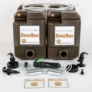 NO BOTTLES. NO KEGS. NO FUSS. THE ALTERNATIVE TO SAVE, STORE AND POUR YOUR HOMEBREWS. Do you want to take the frustration out of packaging your homebrew in bottles or kegs? The Solution. Brewing Tools introduces the BeerBoxTM. The BeerBoxTM eliminates the agony of bottling and the cost, storage, and portability issues of kegs. The BeerBox is easy to clean, easy to fill, easy to store, and easy to share. The BeerBoxTM is a reliable, cost-effective, quality alternative to bottling and kegging home brewed beverages. Standard BeerBoxTM Kit for a 5 Gallon Batch of Home Brew; includes: Two-2.75 gallon BeerBoxTM One-CO2 injector Five-CO2 (16 gram) cartridges One-Hose Tap Adaptor with Hose & Tap PLUS – 2 coasters & 2 stickers PLUS – 2 coasters and 2 stickers The BeerBoxTM is a 2.75 Gallon Container which is 9.625″ high, 6.5″ wide and 15.9″ long and made of food grade HDPE plastic. The front panel allows for a 4″x4″ label for your brew which can be easily viewed. The BeerBoxTM fits in a standard refrigerator making storing your home brew easier than ever. The portability of your home brew is simple – just grab it by its ergonomically designed handle go out the door with the hose tap adaptor and tap, you can pour fresh home brew from inside a cooler with ease.Keg your entire 5 gallon batch