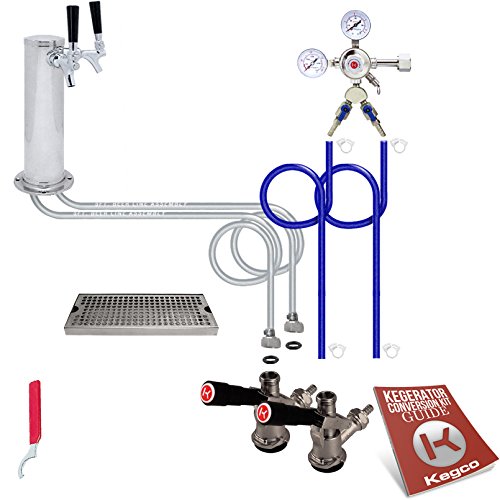 The Deluxe Double Faucet Tower Kegerator Conversion Kit comes with the beer parts you will need to successfully convert your refrigerator into a draft beer dispenser (The Co2 Tank is Extra and not included in the kit). This kegerator kit is designed to run two completely separate kegs. Depending upon your refrigerator capacity, you can run 2 full size kegs, 2 pony kegs, 2 6 gallon kegs or any combination you choose. All the draft beer parts are of the highest commercial grade quality which are designed and built to last.3″ DIAMETER TWO-FAUCET STAINLESS DRAFT BEER TOWER: This NSF approved 3-1/2″ diameter air-cooled stainless steel draft beer tower is an excellent choice for two product draft beer dispense systems! It comes complete with two NSF-approved chrome plated metal faucets with brass levers and two black ABS plastic faucet knobs. Two 5′ lengths of 3/16″ I.D. beer line extend from the bottom of the tower.